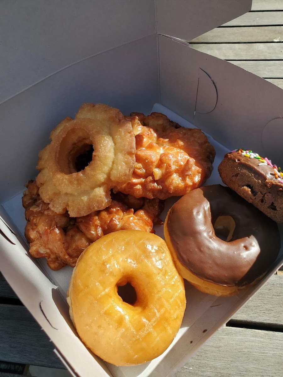 Great little donut shop. Very casual tables inside and out. Blueberry fritter was amazing. Pastrami sandwich was also very good. As with everywhere prices have gone up for what you get, but this place was a pretty good value. Will definitely stop by again.